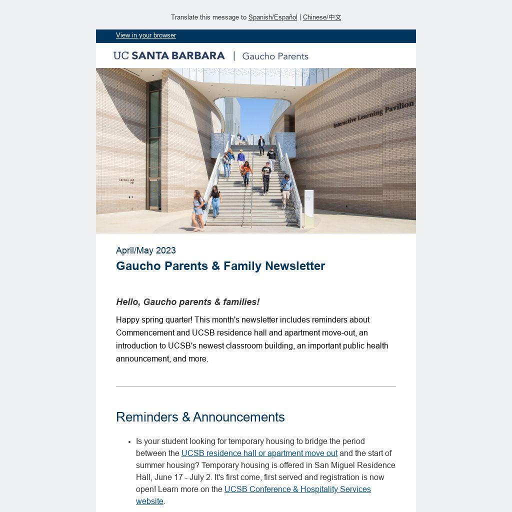 Happy spring quarter! This month's newsletter includes reminders about Commencement and UCSB residence hall and apartment move-out, an introduction to UCSB's newest classroom building, an important public health announcement, and more.