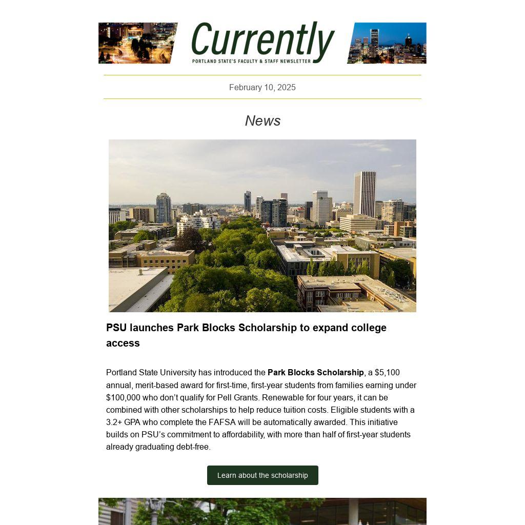 CURRENTLY is a weekly newsletter for the employees of Portland State University, published by University Communications. News items, events and accolades should be sent to currently@pdx.edu. Deadline is noon, the Tuesday before publication. See the Currently website for submission guidelines and schedule.