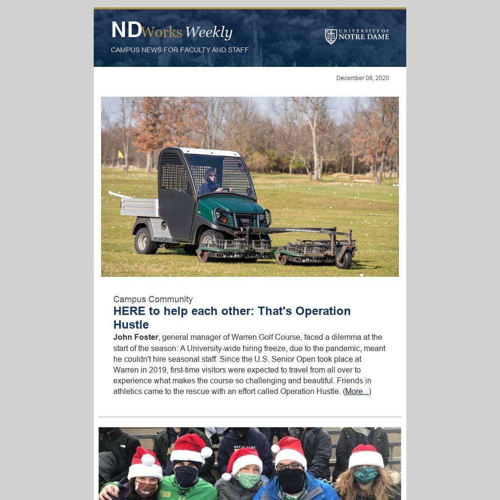 This week's edition of TheWeek@ND Digest stated that accounts payable invoicing capabilities will be available in buyND+ Monday, Dec. 7. The system will launch Monday, Dec. 14. When you place an order in buyND+, as usual, you will be able to track your requisition to purchase order status. Now you can also track the invoice status. Sign up for a virtual demo session through Endeavor. (More...)