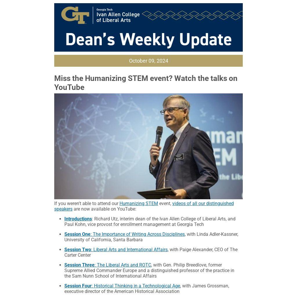 - Introductions: Richard Utz, interim dean of the Ivan Allen College of Liberal Arts, and Paul Kohn, vice provost for enrollment management at Georgia Tech