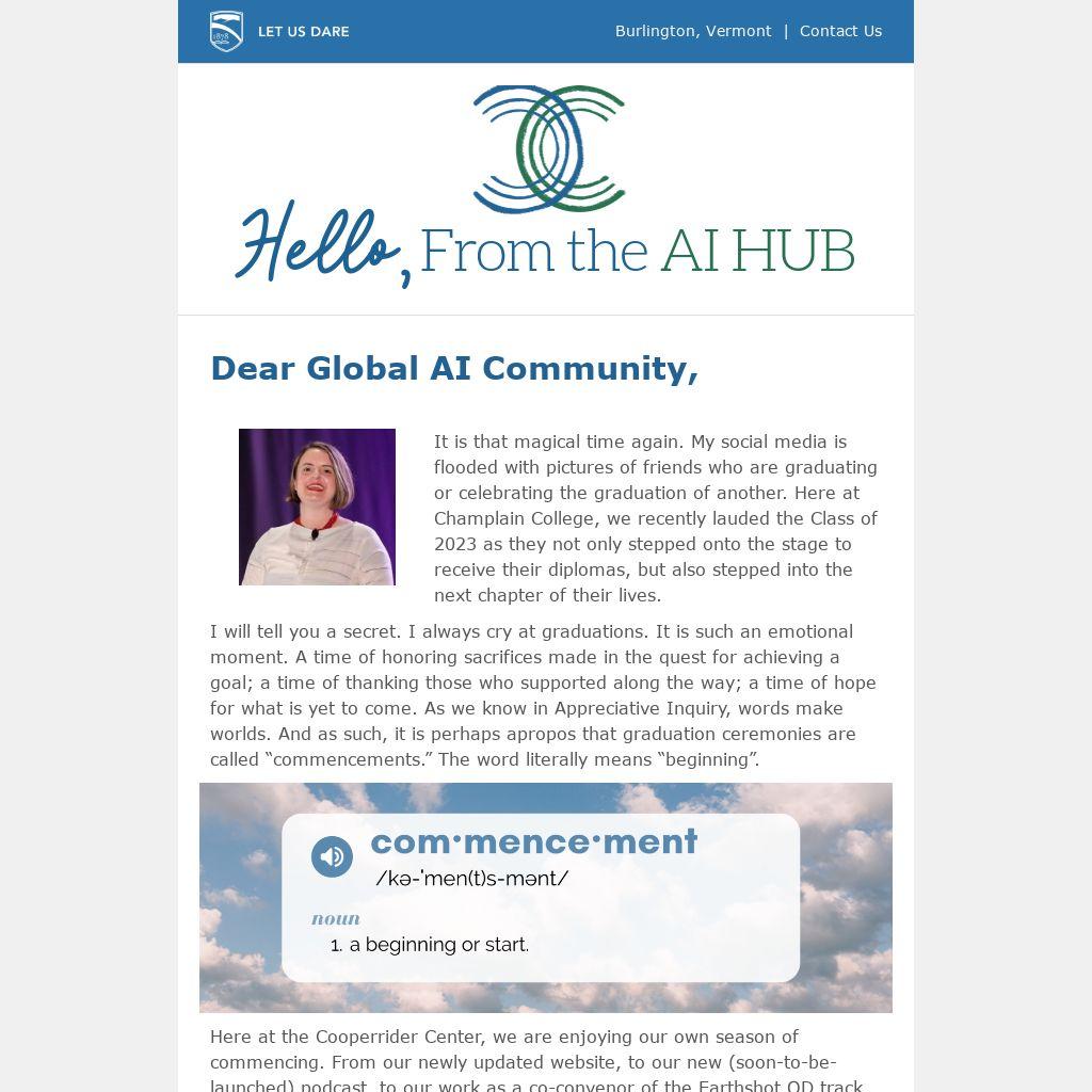 It is that magical time again. My social media is flooded with pictures of friends who are graduating or celebrating the graduation of another. Here at Champlain College, we recently lauded the Class of 2023 as they not only stepped onto the stage to receive their diplomas, but also stepped into the next chapter of their lives.