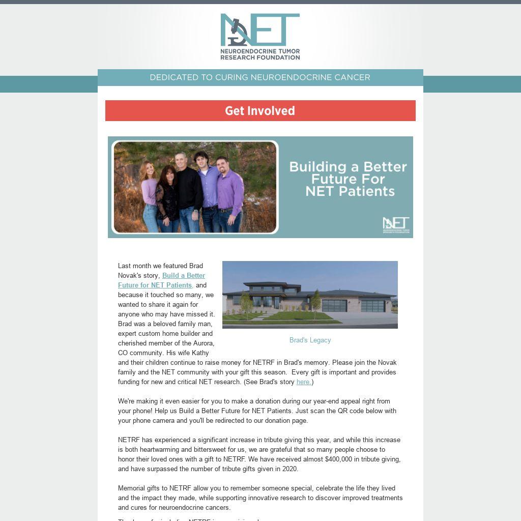 Last month we featured Brad Novak's story, Build a Better Future for NET Patients, and because it touched so many, we wanted to share it again for anyone who may have missed it. Brad was a beloved family man, expert custom home builder and cherished member of the Aurora, CO community. His wife Kathy and their children continue to raise money for NETRF in Brad's memory. Please join the Novak family and the NET community with your gift this season. Every gift is important and provides funding for new and critical NET research. (See Brad's story here.)