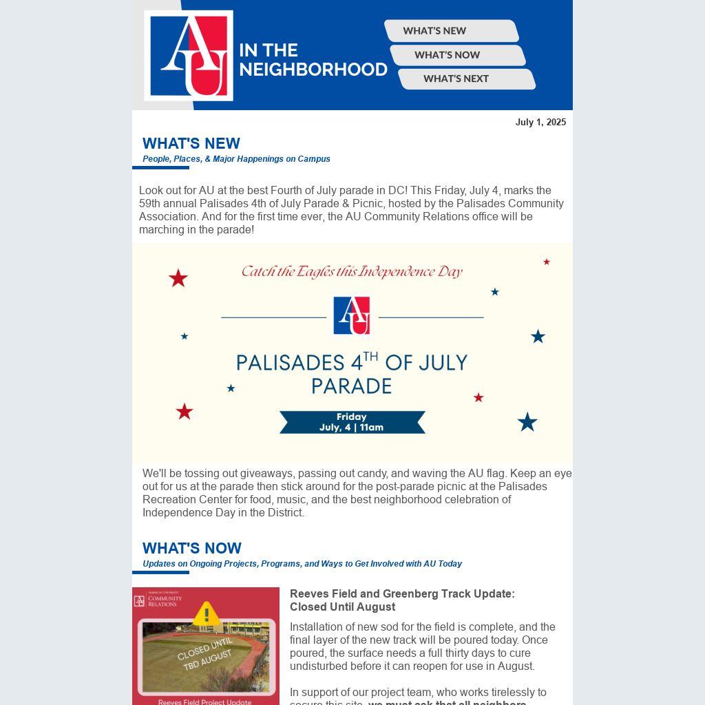 We'll be tossing out giveaways, passing out candy, and waving the AU flag. Keep an eye out for us at the parade then stick around for the post-parade picnic at the Palisades Recreation Center for food, music, and the best neighborhood celebration of Independence Day in the District.