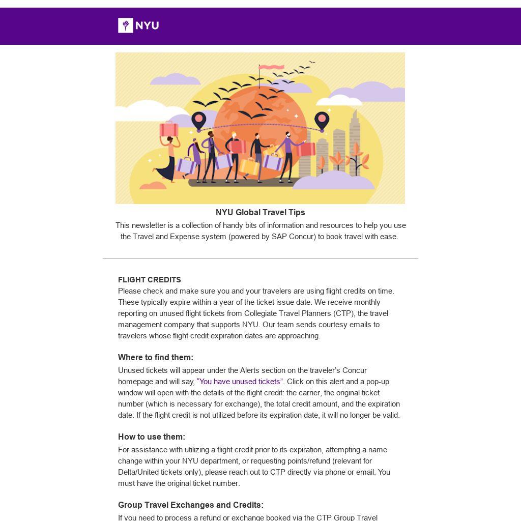 Please check and make sure you and your travelers are using flight credits on time. These typically expire within a year of the ticket issue date. We receive monthly reporting on unused flight tickets from Collegiate Travel Planners (CTP), the travel management company that supports NYU. Our team sends courtesy emails to travelers whose flight credit expiration dates are approaching.