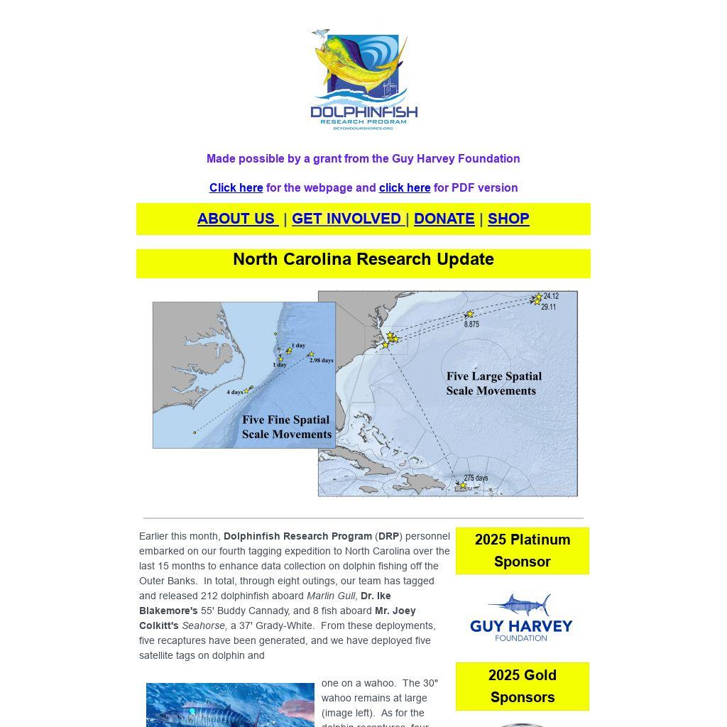 tagging kits, or 2,958 tags, and we estimate by year's end we will distribute at least 100 more kits or 1,500 more tags. Help the DRP continue to engage anglers in research and conservation of dolphin and wahoo in 2026. Click the icons below to shop or donate to support our program.