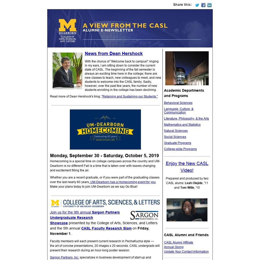 Whether you are a recent graduate, or if you were part of the graduating classes over the last nearly 60 years, UM-Dearborn has a Homecoming event for you. Make your plans today to join UM-Dearborn as we say Go Blue!