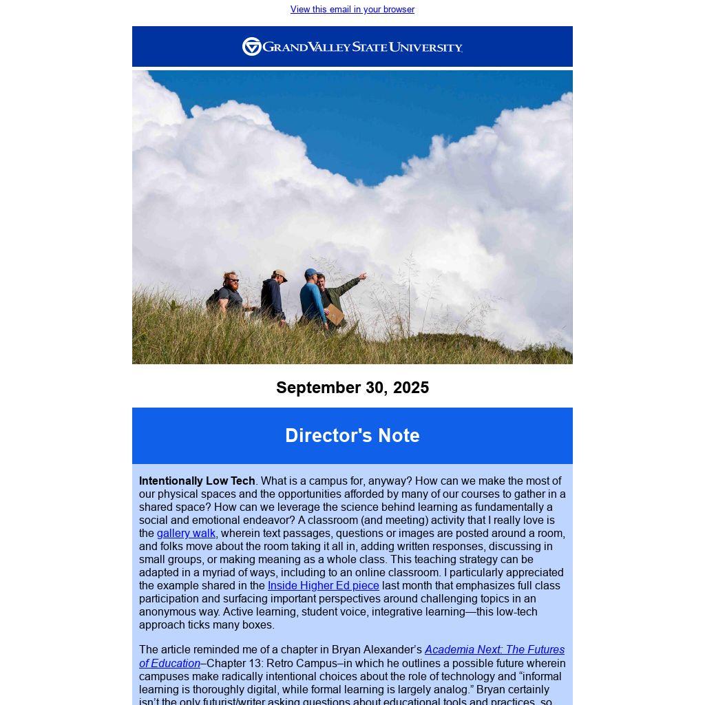 Bringing it back to AI, I read with great interest Ethan Mollick’s recent One Useful Thing post that describes the latest AI tools as wizards with “impressive output, opaque process.” I appreciated his reflection: “This is the issue with wizards: We're getting something magical, but we're also becoming the audience rather than the magician, or even the magician's assistant. In the co-intelligence model, we guided, corrected, and collaborated. Increasingly, we prompt, wait, and verify… if we can.” I don’t think that I am alone in viewing higher education as very much focused on process, along the way helping students become lifelong learners. We need to be talking more about the role of AI and other tools in bringing greater transparency and intentionality to learning. If you read Ethan’s piece, I would love to hear what you think; send me a note or let’s schedule a chat or Walktober venture.