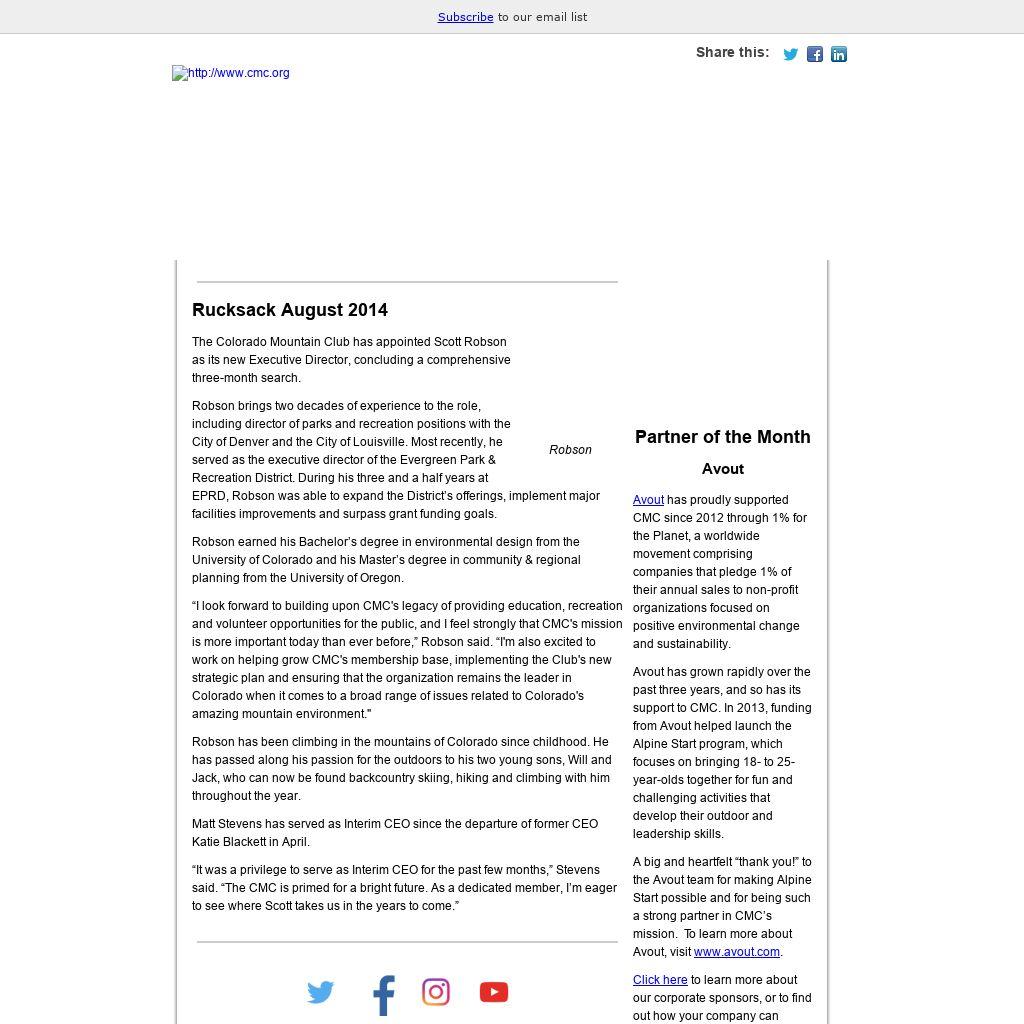 Rucksack August 2014The Colorado Mountain Club has appointed Scott Robson as its new Executive Director, concluding a comprehensive three-month search. Robson brings two decades of experience to the role, including director of parks and recreation positions with the City of Denver and the City of Louisville. Most recently, he served as the executive director of the Evergreen Park & Recreation District. During his three and a half years at EPRD, Robson was able to expand the District’s offerings, implement major facilities improvements and surpass grant funding goals. Robson earned his Bachelor’s degree in environmental design from the University of Colorado and his Master’s degree in community & regional planning from the University of Oregon. “I look forward to building upon CMC's legacy of providing education, recreation and volunteer opportunities for the public, and I feel strongly that CMC's mission is more important today than ever before,” Robson said. “I'm also excited to work on helping grow CMC's membership base, implementing the Club's new strategic plan and ensuring that the organization remains the leader in Colorado when it comes to a broad range of issues related to Colorado's amazing mountain environment." Robson has been climbing in the mountains of Colorado since childhood. He has passed along his passion for the outdoors to his two young sons, Will and Jack, who can now be found backcountry skiing, hiking and climbing with him throughout the year. Matt Stevens has served as Interim CEO since the departure of former CEO Katie Blackett in April.