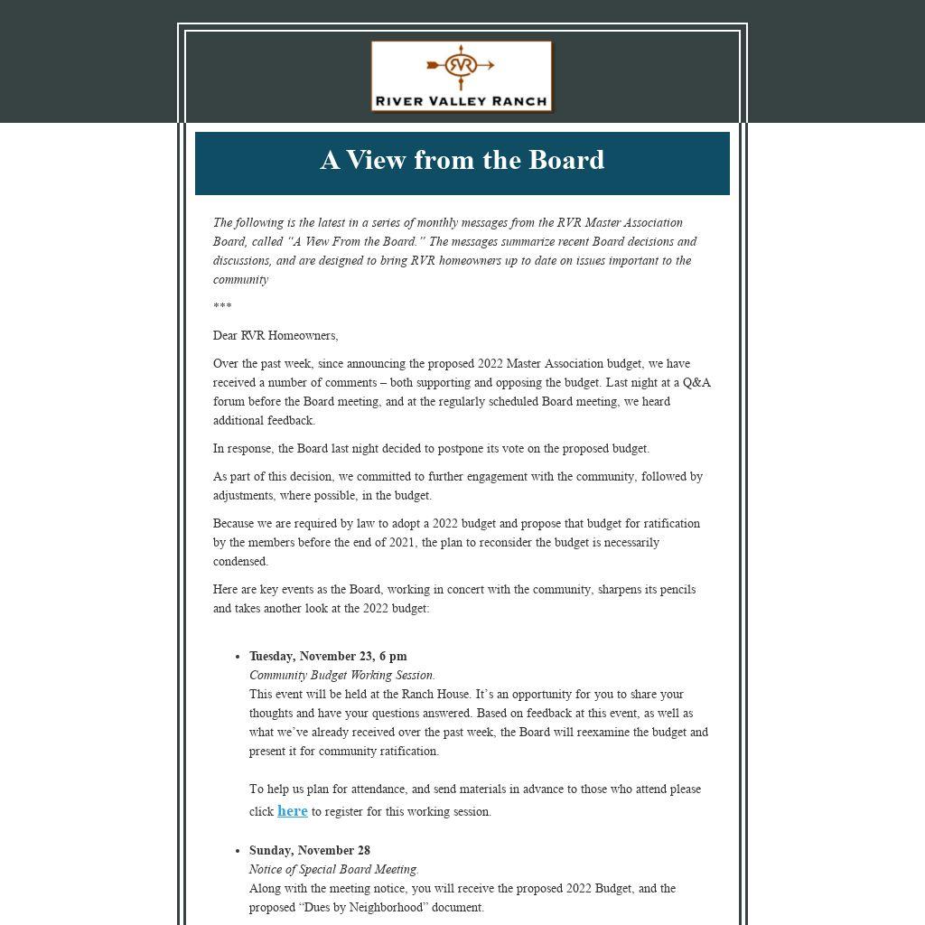This event will be held at the Ranch House. It’s an opportunity for you to share your thoughts and have your questions answered. Based on feedback at this event, as well as what we’ve already received over the past week, the Board will reexamine the budget and present it for community ratification.