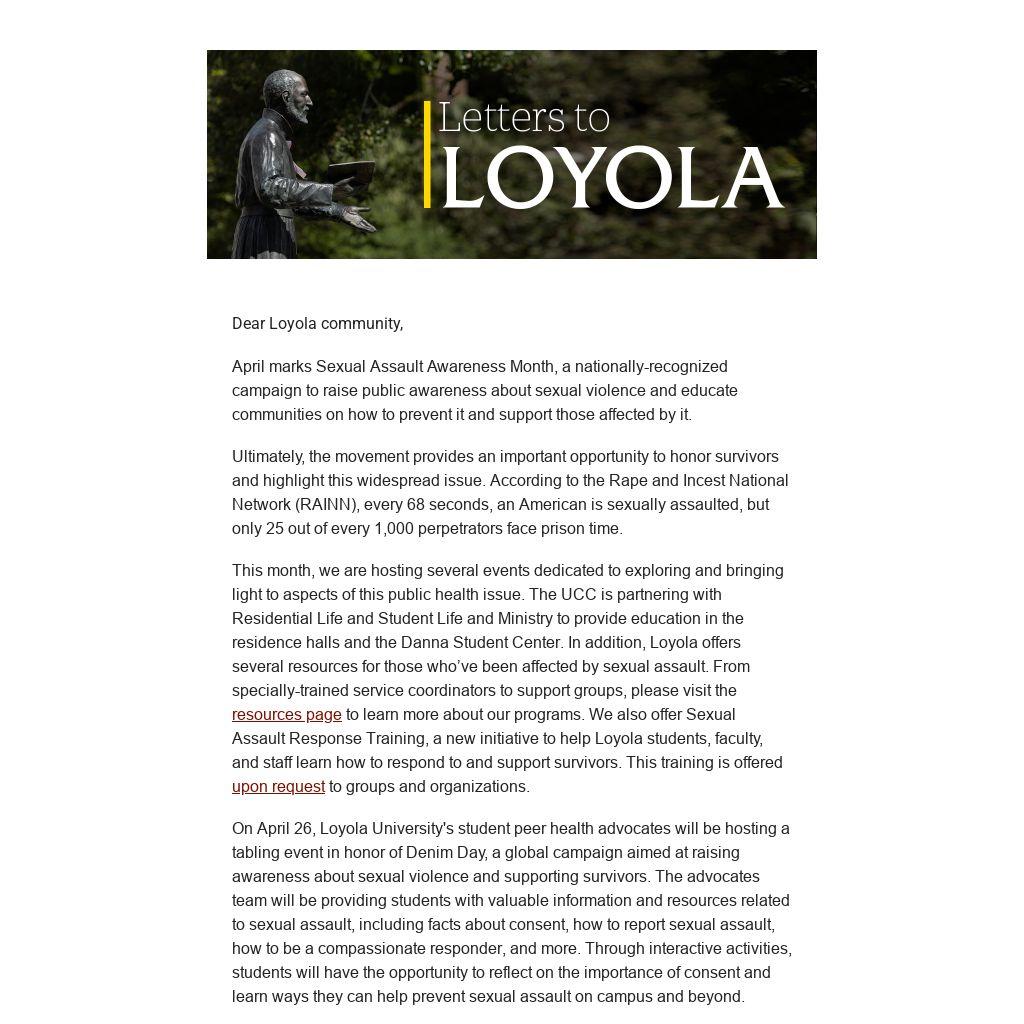 This month, we are hosting several events dedicated to exploring and bringing light to aspects of this public health issue. The UCC is partnering with Residential Life and Student Life and Ministry to provide education in the residence halls and the Danna Student Center. In addition, Loyola offers several resources for those who’ve been affected by sexual assault. From specially-trained service coordinators to support groups, please visit the resources page to learn more about our programs. We also offer Sexual Assault Response Training, a new initiative to help Loyola students, faculty, and staff learn how to respond to and support survivors. This training is offered upon request to groups and organizations.