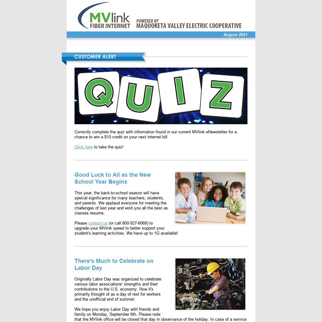 Correctly complete the quiz with information found in our current MVlink eNewsletter for a chance to win a $10 credit on your next internet bill. Click here to take the quiz! ![]()