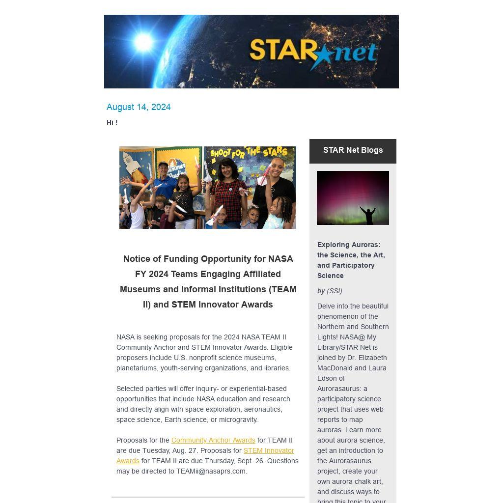 Proposals for the Community Anchor Awards for TEAM II are due Tuesday, Aug. 27. Proposals for STEM Innovator Awards for TEAM II are due Thursday, Sept. 26. Questions may be directed to TEAMii@nasaprs.com.