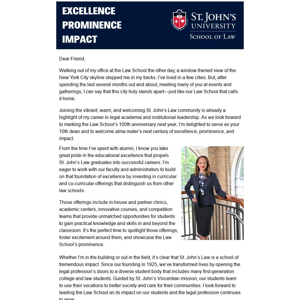 Joining the vibrant, warm, and welcoming St. John’s Law community is already a highlight of my career in legal academia and institutional leadership. As we look forward to marking the Law School’s 100th anniversary next year, I’m delighted to serve as your 10th dean and to welcome alma mater’s next century of excellence, prominence, and impact.