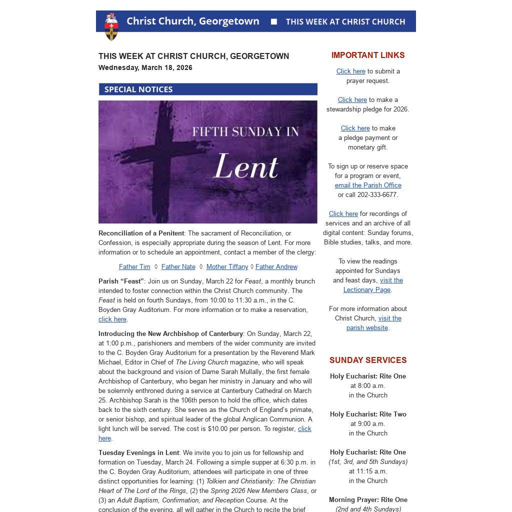 Tuesday Evenings in Lent: We invite you to join us for fellowship and formation on Tuesday, March 24. Following a simple supper at 6:30 p.m. in the C. Boyden Gray Auditorium, attendees will participate in one of three distinct opportunities for learning: (1) Tolkien and Christianity: The Christian Heart of The Lord of the Rings, (2) the Spring 2026 New Members Class, or (3) an Adult Baptism, Confirmation, and Reception Course. At the conclusion of the evening, all will gather in the Church to recite the brief office of Compline. For more information, contact the Parish Office.