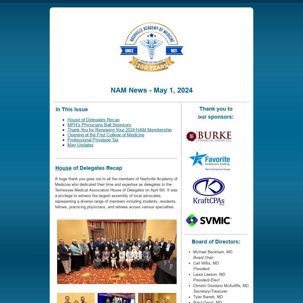 A huge thank you goes out to all the members of Nashville Academy of Medicine who dedicated their time and expertise as delegates to the Tennessee Medical Association House of Delegates on April 6th. It was a privilege to witness the largest assembly of local advocates, representing a diverse range of members including students, residents, fellows, practicing physicians, and retirees across various specialties.