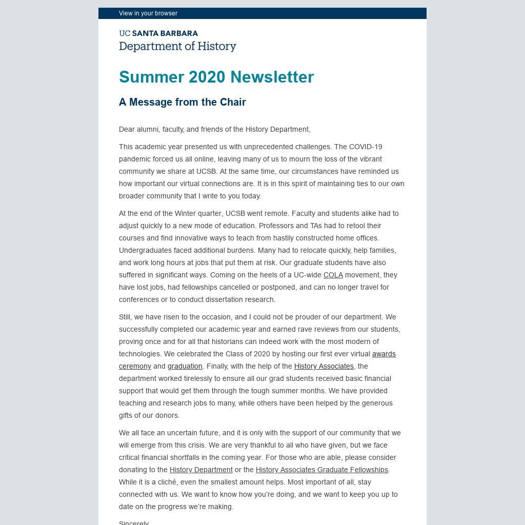 This academic year presented us with unprecedented challenges. The COVID-19 pandemic forced us all online, leaving many of us to mourn the loss of the vibrant community we share at UCSB. At the same time, our circumstances have reminded us how important our virtual connections are. It is in this spirit of maintaining ties to our own broader community that I write to you today.