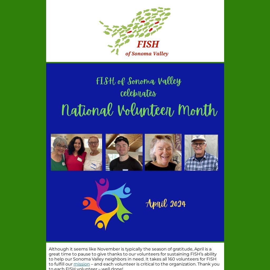 Although it seems like November is typically the season of gratitude, April is a great time to pause to give thanks to our volunteers for sustaining FISH’s ability to help our Sonoma Valley neighbors in need. It takes all 160 volunteers for FISH to fulfill our mission – and each volunteer is critical to the organization. Thank you to each FISH volunteer – well done!
