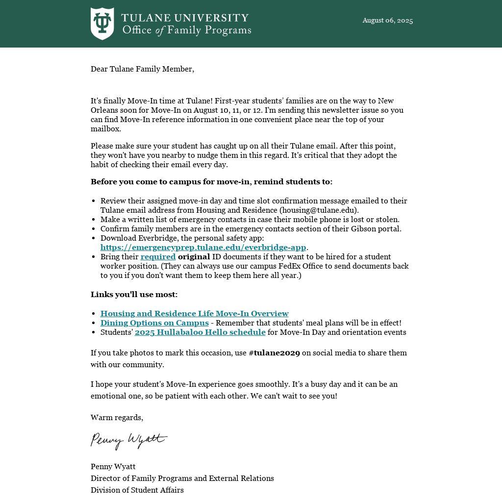 It's finally Move-In time at Tulane! First-year students’ families are on the way to New Orleans soon for Move-In on August 10, 11, or 12. I'm sending this newsletter issue so you can find Move-In reference information in one convenient place near the top of your mailbox.