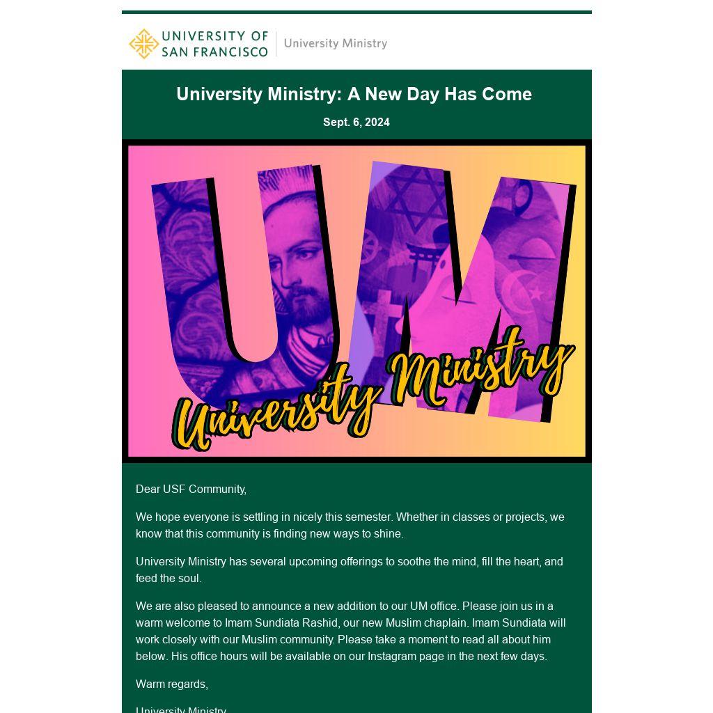 Thank you for reading our bi-weekly newsletter. If you would like to submit content for future newsletters, please make sure to fill out the UM Newsletter Intake Form. If you have any questions about submissions and deadlines, please email um@usfca.edu.