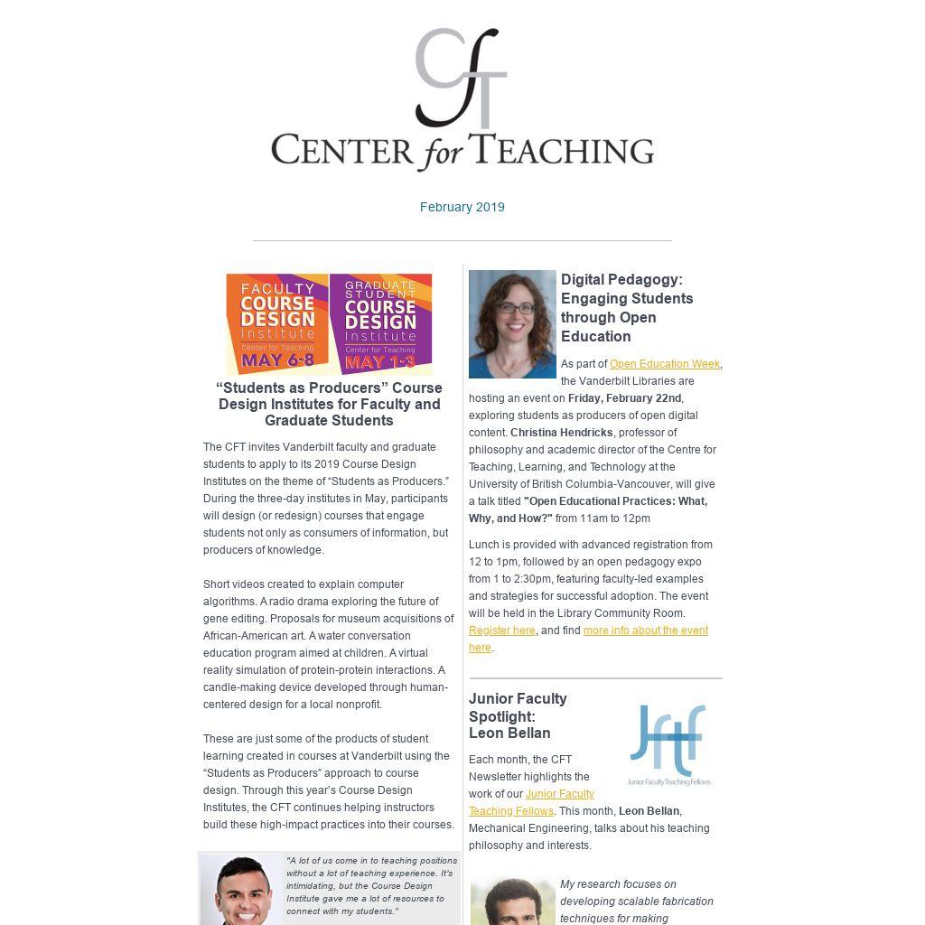 | “Students as Producers” Course Design Institutes for Faculty and Graduate Students The CFT invites Vanderbilt faculty and graduate students to apply to its 2019 Course Design Institutes on the theme of “Students as Producers.” During the three-day institutes in May, participants will design (or redesign) courses that engage students not only as consumers of information, but producers of knowledge.