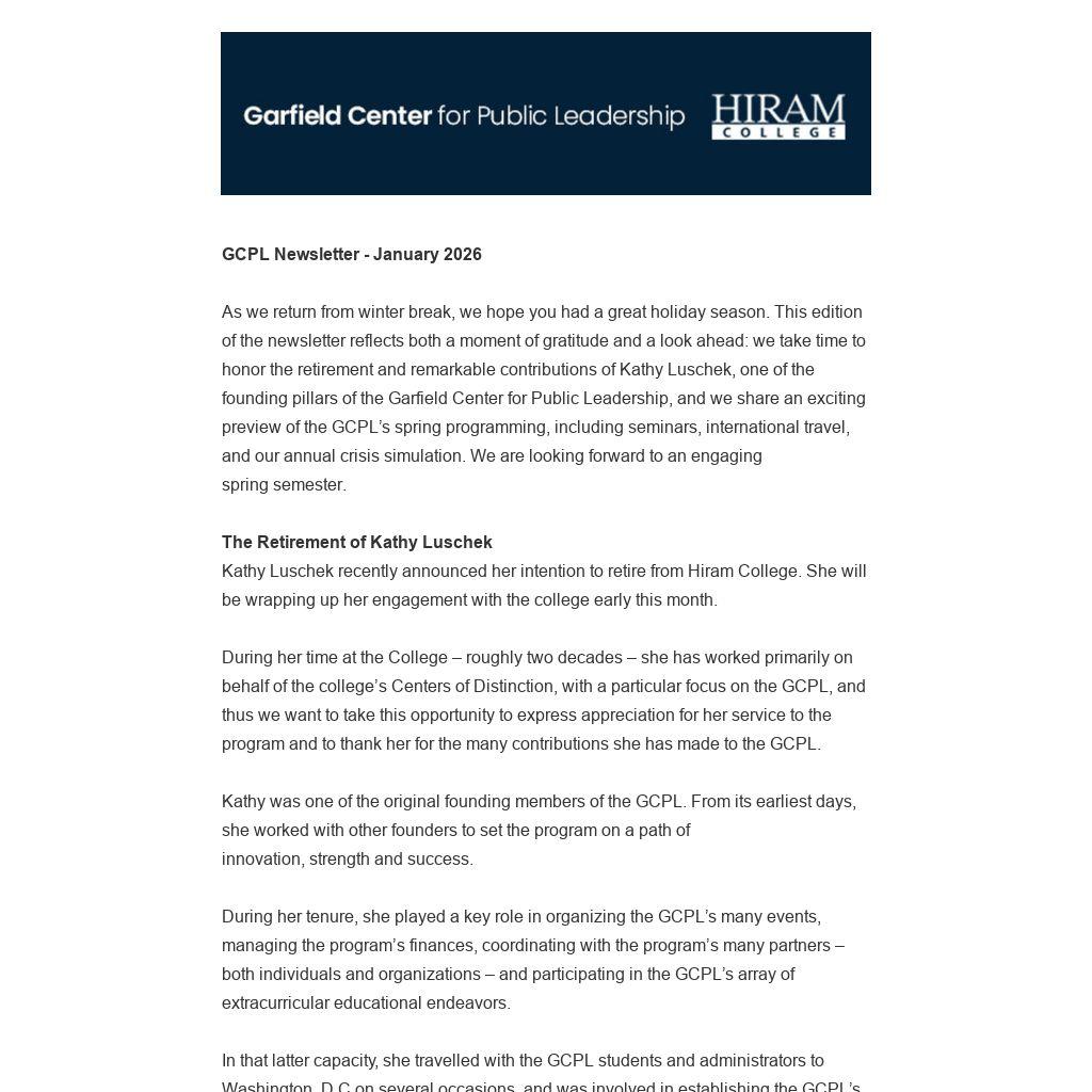 As we return from winter break, we hope you had a great holiday season. This edition of the newsletter reflects both a moment of gratitude and a look ahead: we take time to honor the retirement and remarkable contributions of Kathy Luschek, one of the founding pillars of the Garfield Center for Public Leadership, and we share an exciting preview of the GCPL’s spring programming, including seminars, international travel, and our annual crisis simulation. We are looking forward to an engaging spring semester.