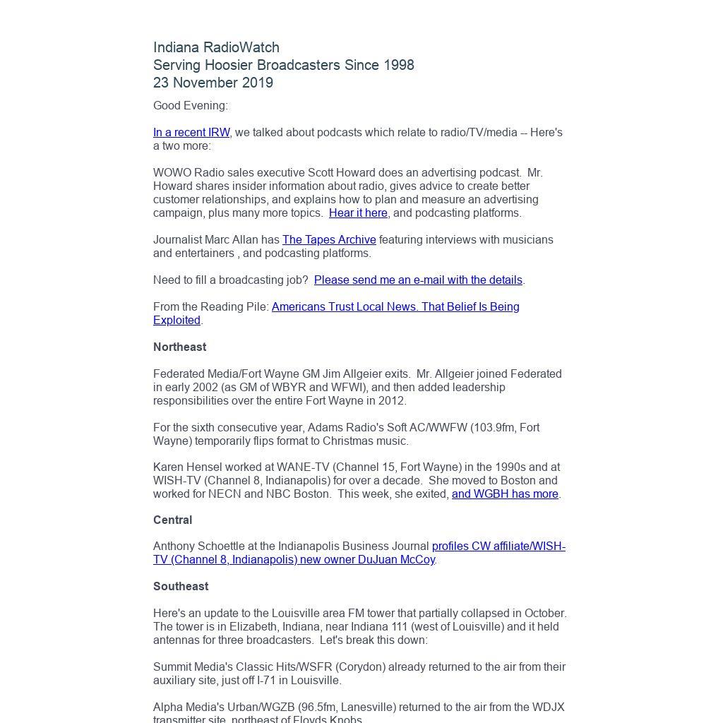 Indiana RadioWatch subscriptions are free. To subscribe, send an e-mail to irw@well.com and we'll add you. After publication, we archive Indiana RadioWatch on the Indiana Radio Archive at indianaradio.net. Please e-mail us your news stories and employment opportunities.