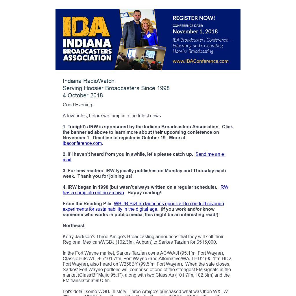 A few notes, before we jump into the latest news: 1. Tonight's IRW is sponsored by the Indiana Broadcasters Association. Click the banner ad above to learn more about their upcoming conference on November 1. Deadline to register is October 19. More at