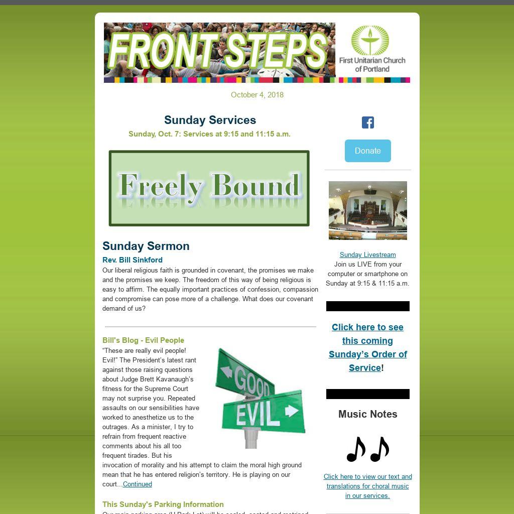 Do You Have an Item for E-news and/or the Sunday Bulletin?If you have an item you’d like published in our weekly Front Steps (eNews) or the Sunday Bulletin, please submit it to: