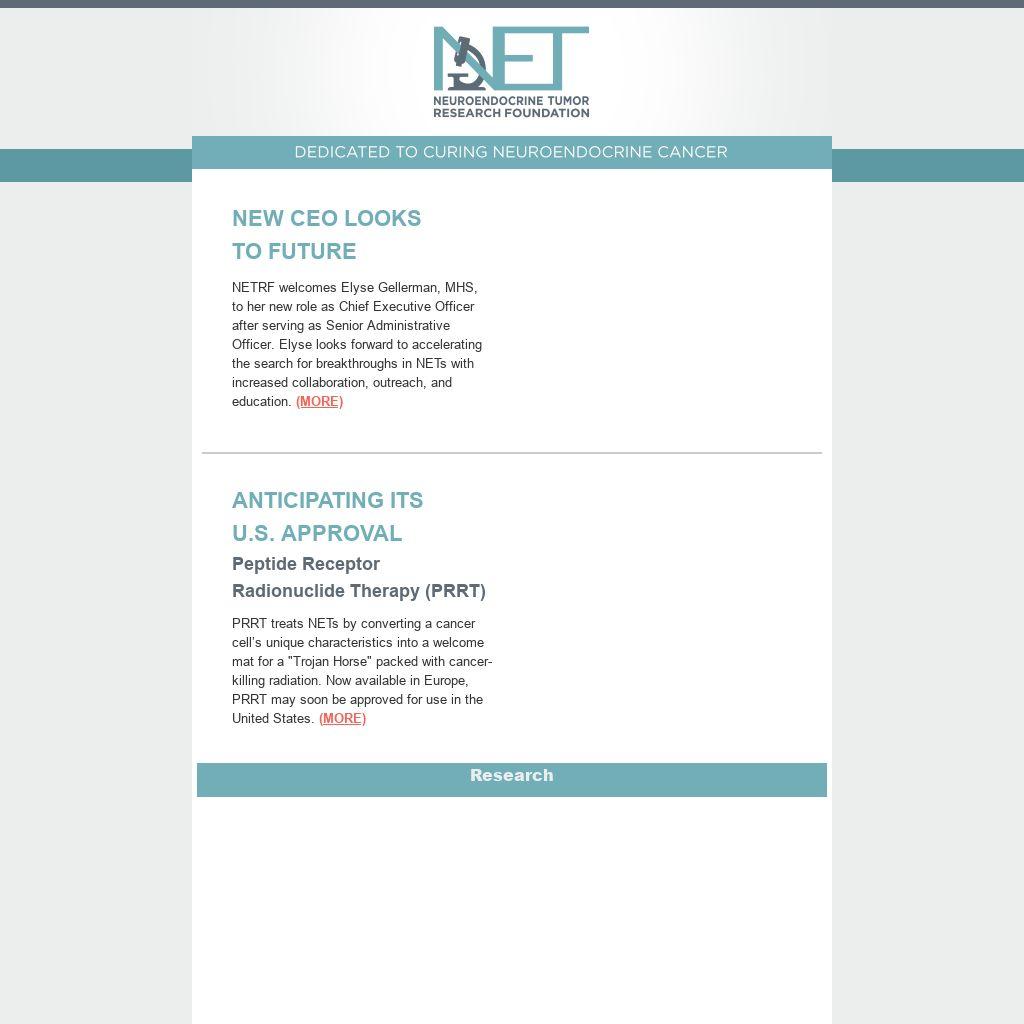 NOVEL IMAGING AGENT FOR NETSNETRF/ERF Pilot Grant AnnouncedThere is a critical need to develop improved diagnostic tools for non-invasive, early detection of NETs in a broader range of patients. New grant-funded research by Babak Behnam Azad, PhD, Johns Hopkins School of Medicine, will work towards this goal. (MORE)