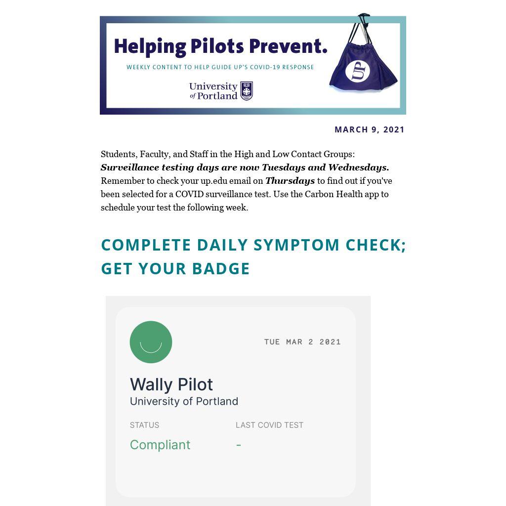 Students, remember to complete the Daily Symptom Check (every day!) on the Carbon Health app to get your green badge. You'll need to show the badge on your phone to get access to campus services like Beauchamp Center, Clark Library, and Bauccio Commons.