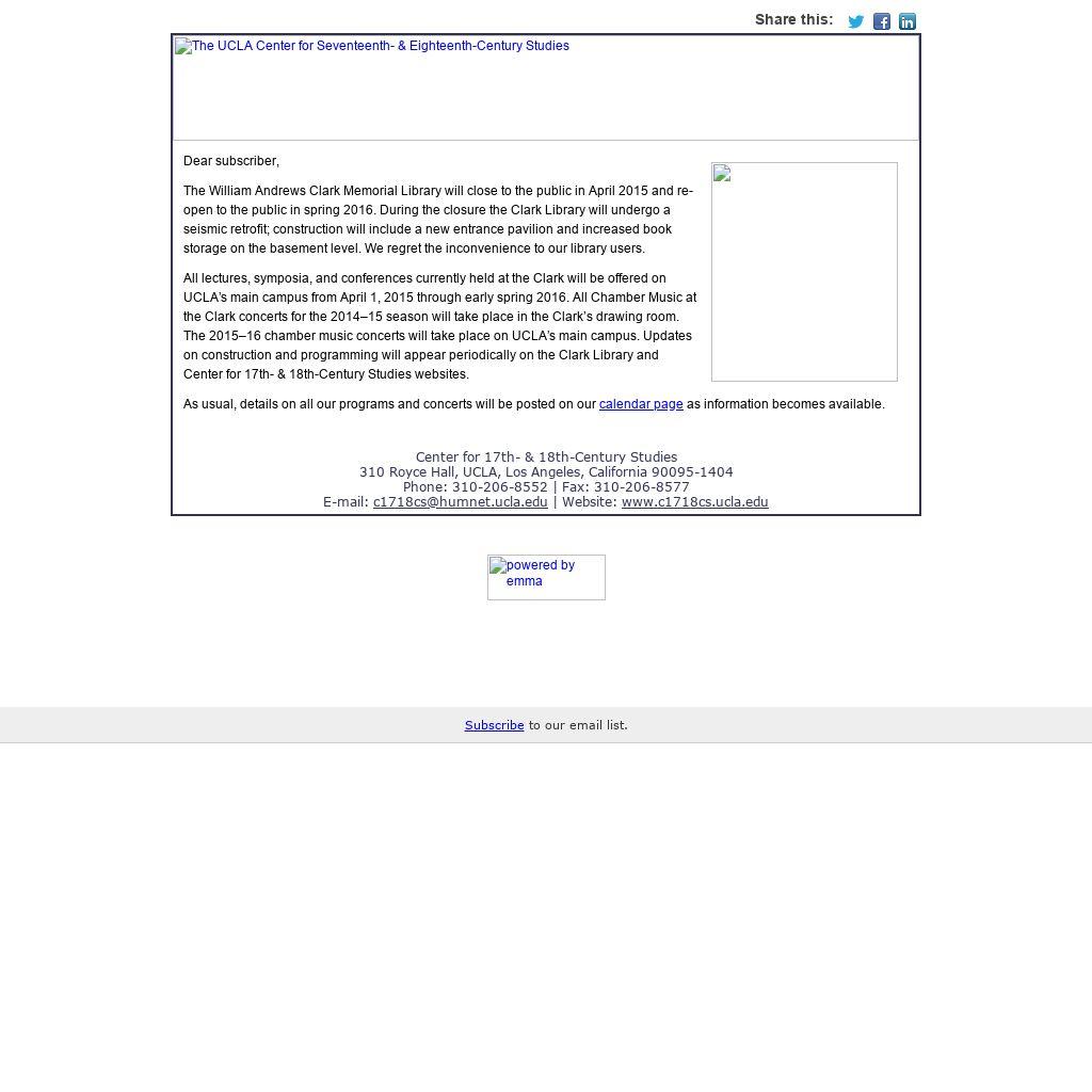 All lectures, symposia, and conferences currently held at the Clark will be offered on UCLA’s main campus from April 1, 2015 through early spring 2016. All Chamber Music at the Clark concerts for the 2014–15 season will take place in the Clark’s drawing room. The 2015–16 chamber music concerts will take place on UCLA’s main campus. Updates on construction and programming will appear periodically on the Clark Library and Center for 17th- & 18th-Century Studies websites.
