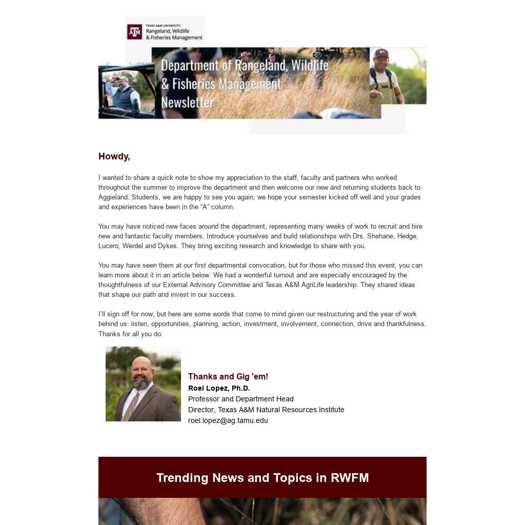 Recently, the Department of Rangeland, Wildlife and Fisheries Management, RWFM, held its first convocation and reflected on successes catalyzed by our department head, Dr. Roel Lopez.