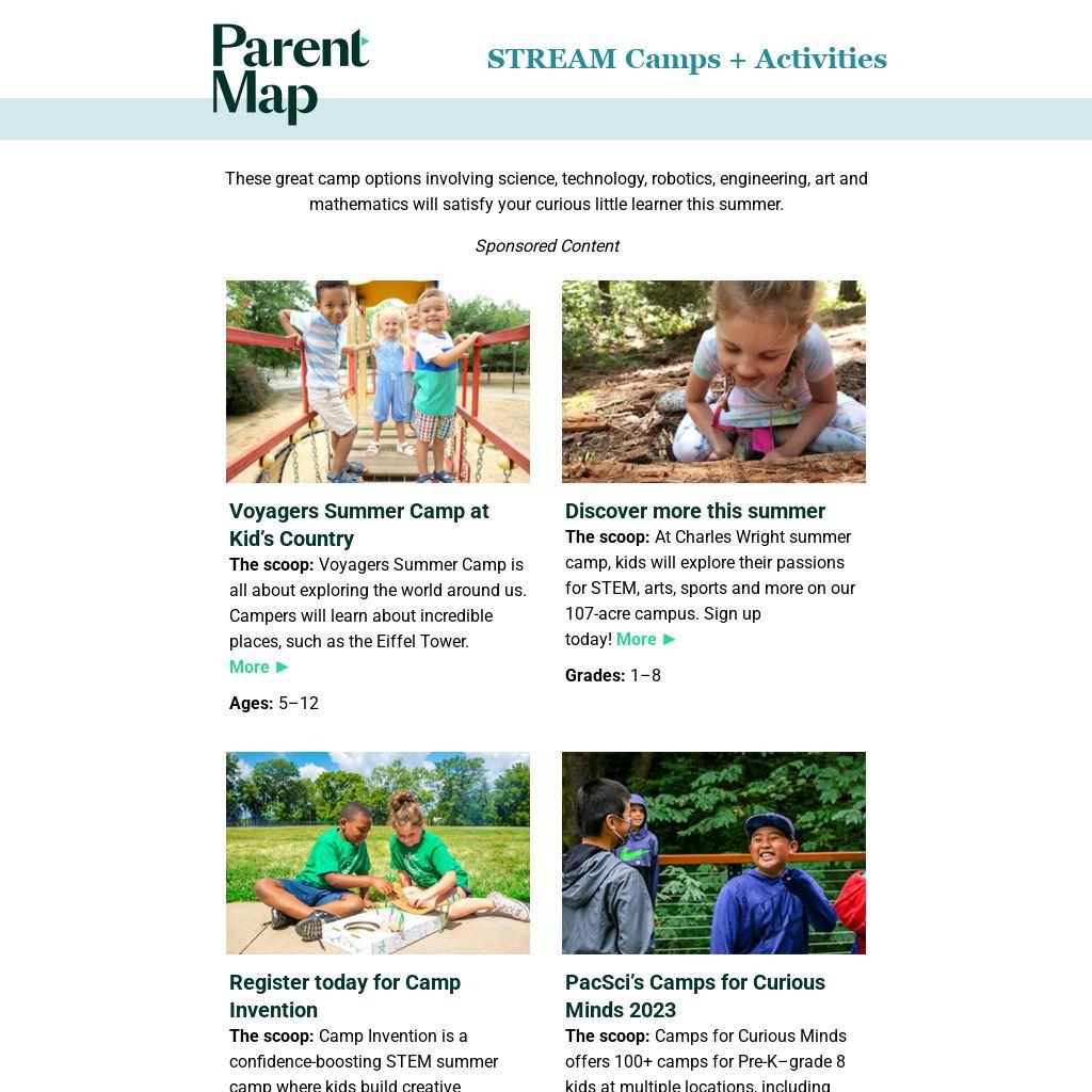 The scoop: Camps for Curious Minds offers 100+ camps for Pre-K–grade 8 kids at multiple locations, including Seattle, Bellevue and South Seattle. More ►
