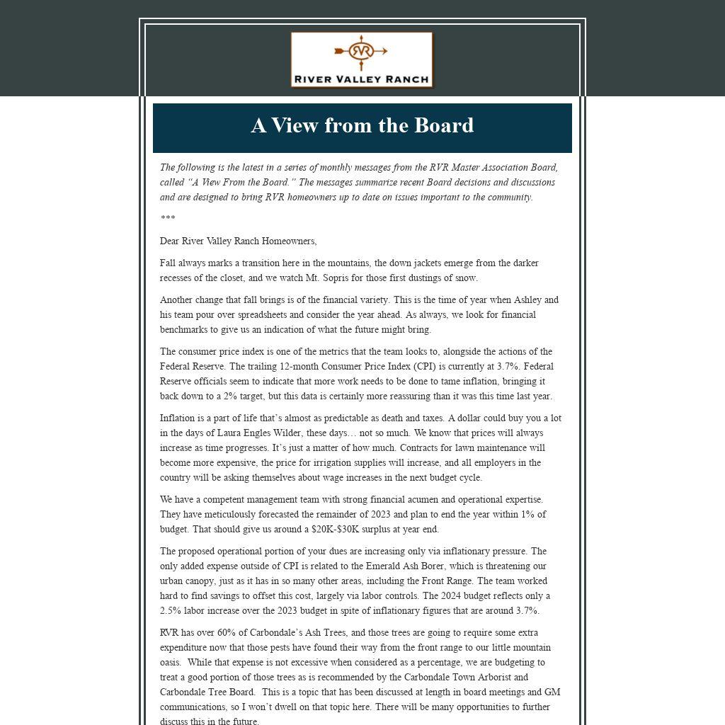 The following is the latest in a series of monthly messages from the RVR Master Association Board, called “A View From the Board.” The messages summarize recent Board decisions and discussions and are designed to bring RVR homeowners up to date on issues important to the community.