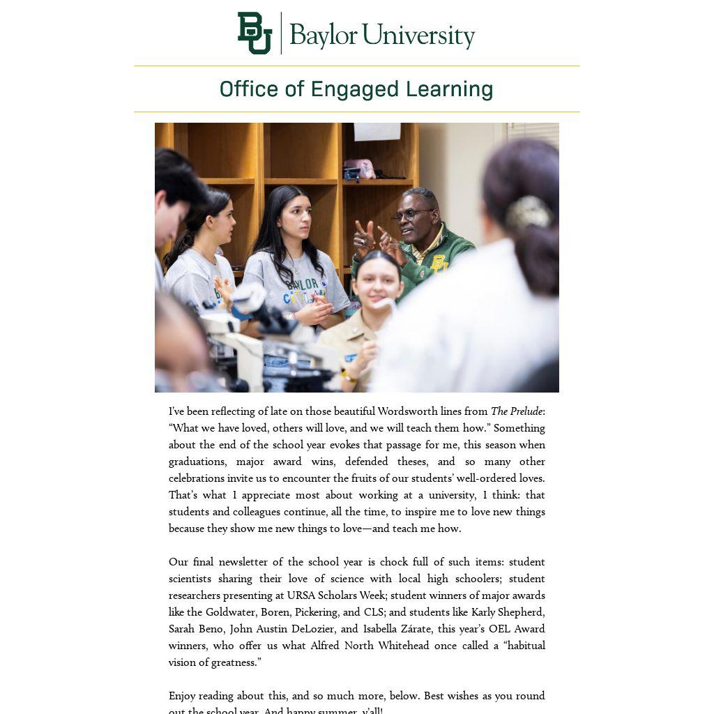 Our final newsletter of the school year is chock full of such items: student scientists sharing their love of science with local high schoolers; student researchers presenting at URSA Scholars Week; student winners of major awards like the Goldwater, Boren, Pickering, and CLS; and students like Karly Shepherd, Sarah Beno, John Austin DeLozier, and Isabella Zárate, this year’s OEL Award winners, who offer us what Alfred North Whitehead once called a “habitual vision of greatness.”