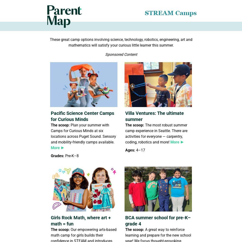 These great camp options involving science, technology, robotics, engineering, art and mathematics will satisfy your curious little learner this summer.