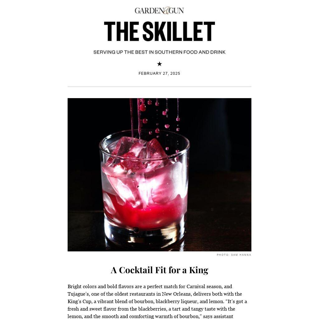 Bright colors and bold flavors are a perfect match for Carnival season, and Tujague’s, one of the oldest restaurants in New Orleans, delivers both with the King’s Cup, a vibrant blend of bourbon, blackberry liqueur, and lemon. “It’s got a fresh and sweet flavor from the blackberries, a tart and tangy taste with the lemon, and the smooth and comforting warmth of bourbon,” says assistant manager Brett Moore. Find the recipe below, along with more ideas for Mardi Gras.