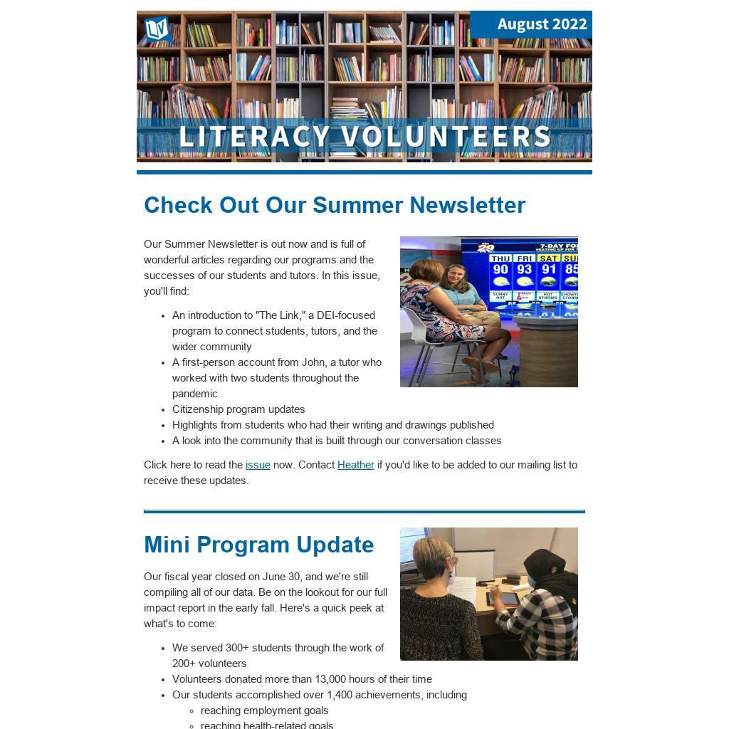 At the end of each fiscal year, we also survey our volunteer tutors to hear about their experiences and find ways to improve our programs. Over the next several weeks, we'll evaluate those responses as we develop our program plans for this year. We hope to offer many more workshops, enhance resources both in our office and online, and create opportunities for students and tutors to gather together.