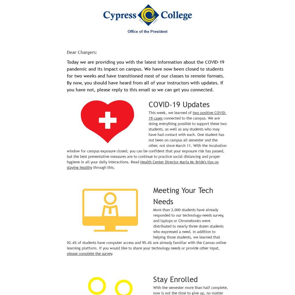 To provide you with the latest information and answer your questions, two town hall meetings have been scheduled for next week. The meetings will provide an opportunity to hear from student, faculty, and campus leaders; experts in online instruction; the Health Center; and more. Town halls will take place on Tuesday, March 31, from 4-5 p.m., and Wednesday, April 1, from 12-1 p.m. Check the website and your email next week for a link to these virtual events.