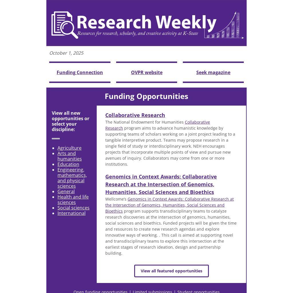 The Kansas State University, Office of Research Development’s Faculty Development Award (FDA) and University Small Grant (USRG) programs provide international meeting travel support and seed grant funding to K-State faculty. The FDA award can also be used to meet with program officers from potential external funders. Awards for the FDA program typically range from $1,000 to $3,500. For USRG awards, the range is $2,000 to $5,000. The proposals for both programs are due by 5 pm on October 1, 2025 and should be submitted via ord@ksu.edu.