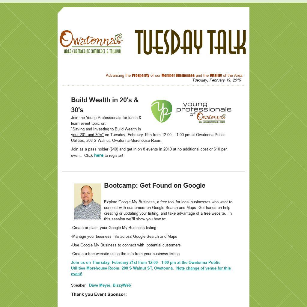 "Saving and Investing to Build Wealth in your 20's and 30's" on Tuesday, February 19th from 12:00 - 1:00 pm at Owatonna Public Utilities, 208 S Walnut, Owatonna-Morehouse Room.