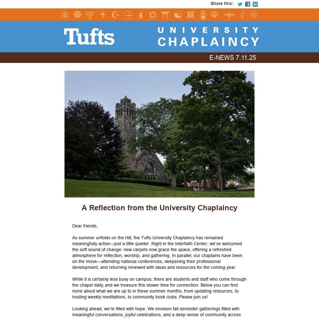 As summer unfolds on the Hill, the Tufts University Chaplaincy has remained meaningfully active—just a little quieter. Right in the Interfaith Center, we’ve welcomed the soft sound of change: new carpets now grace the space, offering a refreshed atmosphere for reflection, worship, and gathering. In parallel, our chaplains have been on the move—attending national conferences, deepening their professional development, and returning renewed with ideas and resources for the coming year.