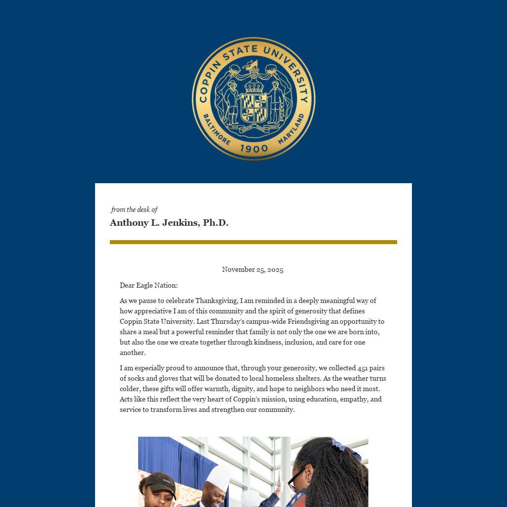 In this season of gratitude, I am thankful for our students, whose resilience, curiosity, and dreams push us all to be better; our dedicated faculty, who pour their expertise and hearts into empowering the next generation; our committed staff, whose often-unseen work keeps this university moving forward every single day; and our proud alumni, who carry Coppin’s legacy into the world and demonstrate the impact of an education rooted in purpose and justice.