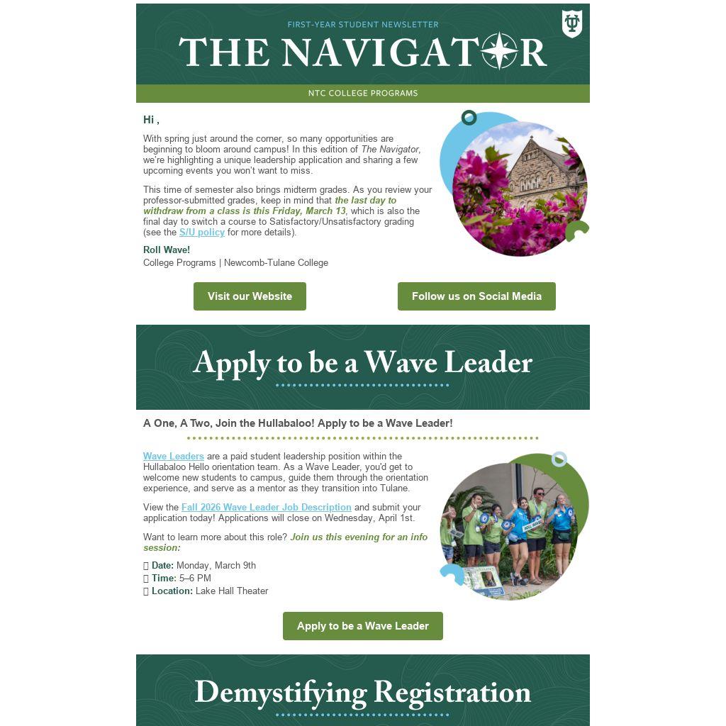 With spring just around the corner, so many opportunities are beginning to bloom around campus! In this edition of The Navigator, we’re highlighting a unique leadership application and sharing a few upcoming events you won’t want to miss.