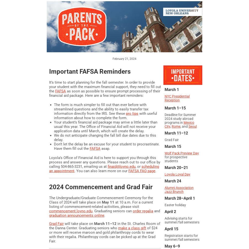By proactively assisting them now, you'll empower your student to conclude the academic year smoothly and embark on the next adventure with confidence. Have questions? Contact Residential Life at 504-865-2445 or reslife@loyno.edu.