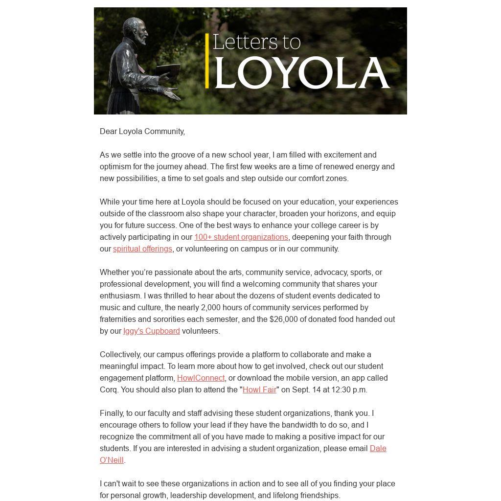 While your time here at Loyola should be focused on your education, your experiences outside of the classroom also shape your character, broaden your horizons, and equip you for future success. One of the best ways to enhance your college career is by actively participating in our 100+ student organizations, deepening your faith through our spiritual offerings, or volunteering on campus or in our community.