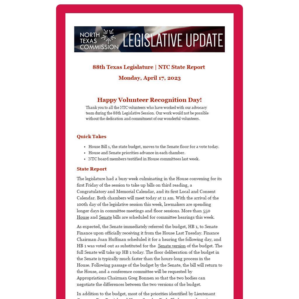 Last week, the NTC engaged on priority bills heard in the House Ways & Means and House Public Education committees. NTC board members traveled to Austin to testify about the NTC’s position favoring economic development incentives and against public school vouchers. On Monday, April 10, Aledo Superintendent Dr. Susan Bohn, Chair of the NTC Superintendents Council, testified in support of HB 5, the Texas Jobs and Security Act [43:12]. On Tuesday, April 11, NTC Chairman Andrew Johnsen testified against HB 4340 during the hours-long hearing regarding the creation of Education Savings Accounts and public school vouchers [3:42:25].
