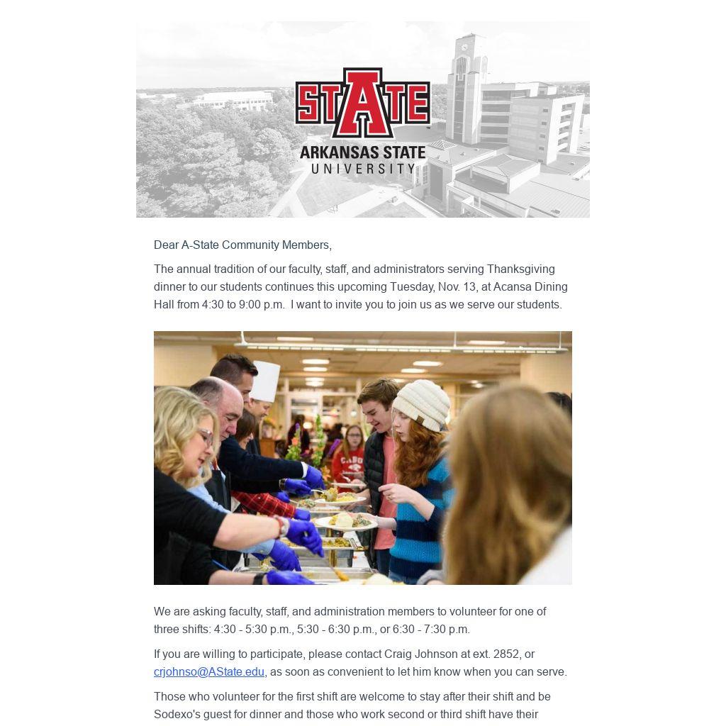 If you are willing to participate, please contact Craig Johnson at ext. 2852, or crjohnso@AState.edu, as soon as convenient to let him know when you can serve.