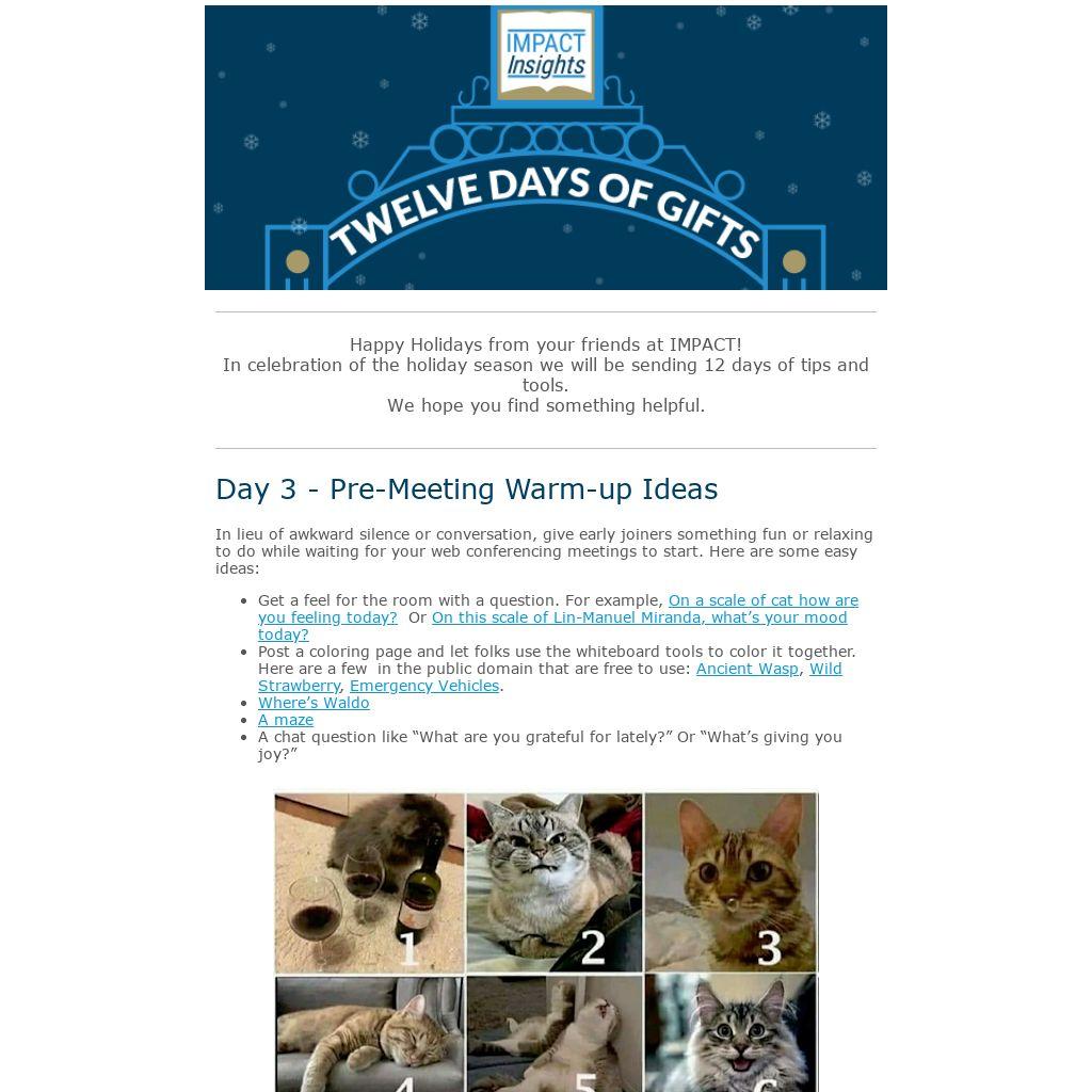 Happy Holidays from your friends at IMPACT! In celebration of the holiday season we will be sending 12 days of tips and tools. We hope you find something helpful.