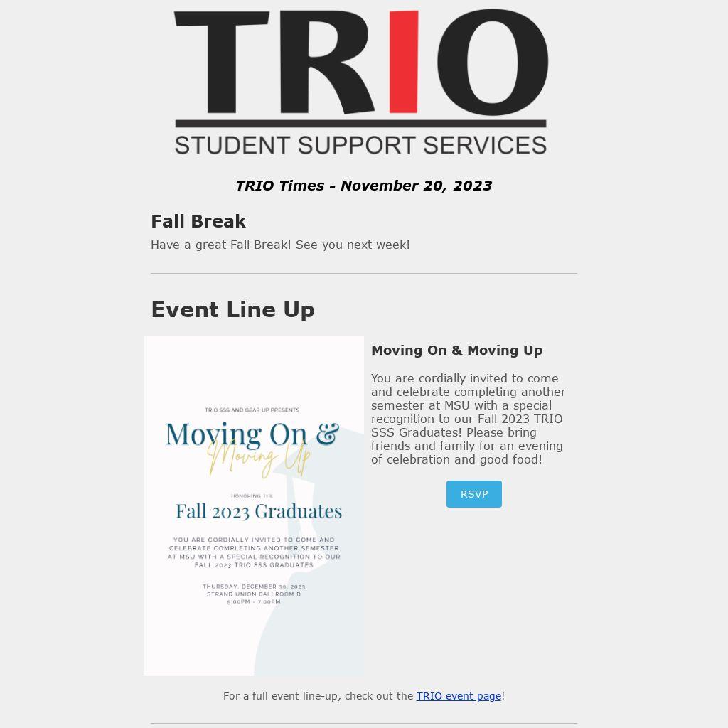 You are cordially invited to come and celebrate completing another semester at MSU with a special recognition to our Fall 2023 TRIO SSS Graduates! Please bring friends and family for an evening of celebration and good food!